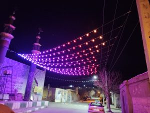 آذین بندی شهر مزداوند به مناسبت ایام الله دهه فجر و اعیاد شعبانیه با ریسه های برنامه پذیر و نصب آذین بندی نورانی با والواشر کم مصرف با طرح پرچم ایران روی دیوارساحلی